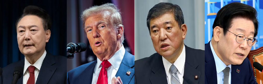 좌측부터 대한민국 윤석열 대통령, 미국 도널드 트럼프 대통령, 일본 이시바 시게루 총리, 더불어민주당 이재명 대표