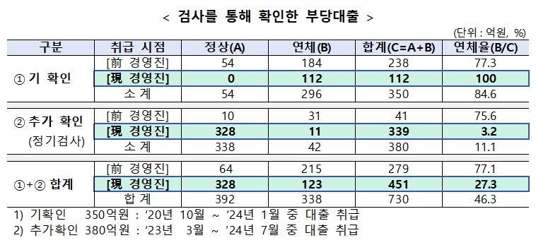 손 전 회장 친인척 관련 대출 중 60%가량(451억 원)은 현 경영진 취임 이후 실행됐으며, 전체 대출의 절반가량(338억 원)은 부실화됐다. 또한, 우리은행 한 지역 본부장은 손 전 회장의 친인척이 운영하는 법인에 약 43억 원을 대출해준 후, 퇴직 후 해당 법인에 재취업한 것으로 밝혀졌다.