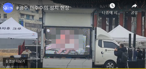지난 15일 광주 5·18 민주광장에서 열린 윤 대통령 탄핵에 찬성 집회 현장에서 '사자후 크루'가 영상 차량을 이용해 윤석열 대통령 부부를 대상으로 한 '딥페이크 음란물' 영상을 송출했다. (사진: 사자후 크루 유튜브 화면 캡쳐)