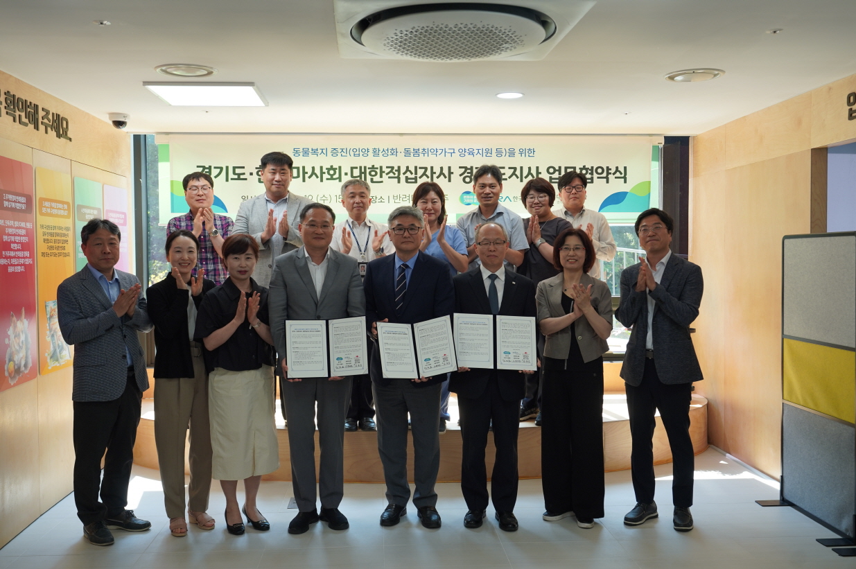 경기도는 19일 반려마루 여주에서 한국마사회, 대한적십자사 경기도지사와 ‘유기·반려동물 물품꾸러미 지원사업’ 업무협약을 맺고 돌봄취약가구의 반려동물 양육지원과 유기동물 입양 활성화 등에 협력하기로 했다.