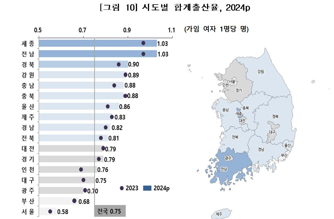 지역별로는 세종과 전남(1.03명), 경북(0.90명), 강원(0.89명) 등이 전국 평균(0.75명)을 웃돌았다. 반면 서울은 0.58명으로 전국 최저를 기록했다.