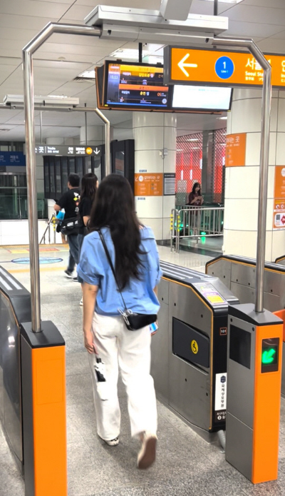 한 승객이 태그리스 결제를 위해 게이트를 통과하고 있다. (사진출처: 티머니 제공)