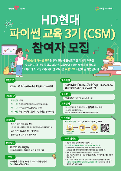 ‘HD현대 파이썬 교육’ 모집 기간은 4월 1일(화) 오후 5시까지로, 국민기초생활수급자, 차상위계층, 한부모 가정 내 경기도 성남시에 거주하는 중3~고1 학생을 우대 선발할 예정이다. 아이들과미래재단 공식 홈페이지와 모집 접수 링크(www.bit.ly/HD_CSM3)를 통해 보다 자세한 모집 요건을 확인 후 접수할 수 있다.