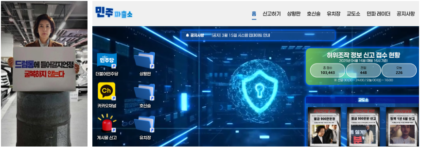‘민주파출소’는 더불어민주당이 운영하는 온라인 신고 플랫폼으로, 허위조작정보에 대해 법적 대응을 추진하고 있다. 2025년 1월 공식 출범한 이후, 가짜뉴스 유포자 및 관련 커뮤니티에 대해 지속적으로 고발을 이어왔다. 특히 ‘이재명 체포조’, ‘이재명 암살단’ 등 혐오성 표현을 담은 온라인 게시물에 대해서도 강경 대응 방침을 밝혔다.