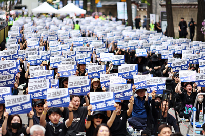 6월 14일 정부서울청사 인근에서 열린 집회에서 참석자들이 관련 구호를 외치고 있다. (사진: 연합뉴스)