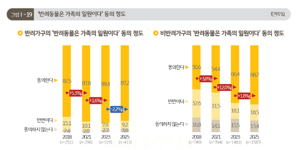 조사에 따르면 반려가구의 87.2%, 비반려가구의 68.2%가 “반려동물은 가족의 일원”이라는 인식에 동의했다. 특히 비반려가구의 동의율이 해마다 상승하고 있다는 점은, 반려동물에 대한 사회적 수용도가 꾸준히 확장되고 있음을 보여준다.