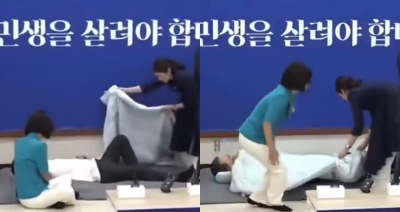 강선우 여가부 장관 후보자가 민주당 당 대표였던 이재명 대통령이 단식 투쟁을 하던 중 자리에 눕자 이불을 덮어주고 있다. (사진: 델리민주 캡처)