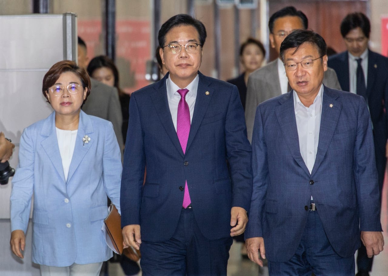 국민의힘 송언석 비상대책위원장 겸 원내대표(가운데)와 김정재 정책위의장(왼쪽), 정점식 사무총장을 비롯한 비대위원들이 24일 국회에서 열린 비상대책위원회 회의에 입장하고 있다. (사진: 연합뉴스)