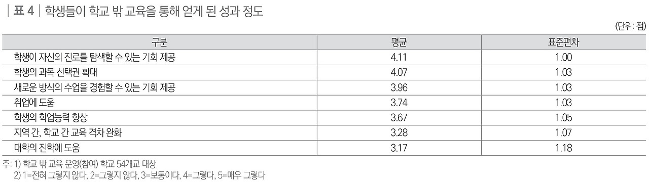학생들이 ‘학교 밖 교육’을 통해 얻게 된 성과의 정도에 대해 ‘학생이 자신의 진로를 탐색할 수 있는 기회 제공’이 5점 만점에 4.11점으로 가장 높았고, ‘학생의 과목 선택권 확대’가 4.07점으로 뒤를 이었다.