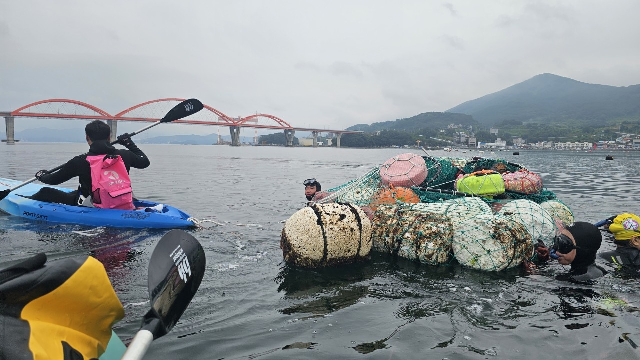 수중 정화활동에 참여한 거제해녀아카데미 소속 활동가(해녀)들이 태왁을 이용해 물속에서 수거한 쓰레기들을 육지로 끌고 나오고 있다. (자료: 환경재단)