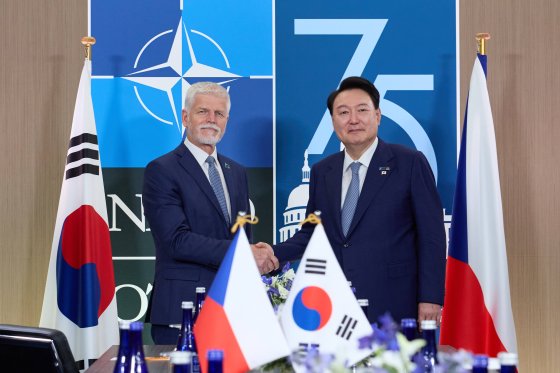 윤석열 대통령이 지난 10일(현지시간) 북대서양조약기구(나토) 75주년 정상회의가 개최된 미국 워싱턴DC에서 페트르 파벨 체코 대통령과 정상회담에 앞서 악수하고 있다. 이날 회담에서 윤 대통령은 체코 원전 사업과 관련해 한국의 원전 건설 경쟁력을 설명했다. (출처: 뉴스1)