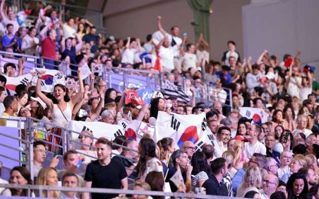 31일(현지시간) 프랑스 파리 그랑 팔레에서 열린 2024 파리 올림픽 펜싱 남자 사브르 단체 결승전에서 한국과 헝가리의 경기에서 한국 관중들이 응원을 하고 있다. (자료: 연합뉴스)