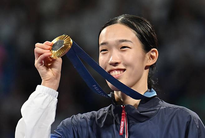지난 8일(현지시간) 프랑스 파리 그랑팔레 태권도경기장에서 열린 2024 파리올림픽 태권도 여자 57kg급 결승에서 이란의 나히드 키야니찬데에게 승리한 김유진이 금메달을 목에 걸고 포즈를 취하고 있다. (사진출처: 연합뉴스)