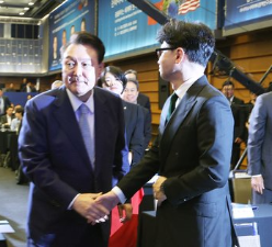 윤석열 대통령이 27일 서울 중구 대한상공회의소에서 문화일보 주최로 열린 문화미래리포트2024에서 국민의힘 한동훈 대표와 인사 뒤 행사장을 떠나고 있다. (사진출처 : 연합뉴스)