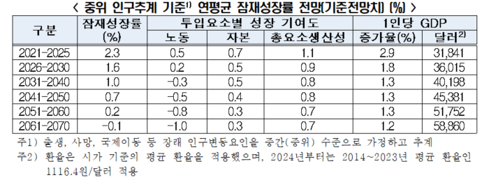 28일 발표된 한경협의 보고서에 따르면, 인구 감소로 인해 한국의 잠재성장률은 점진적으로 하락할 것으로 예상된다. 구체적으로 ▲2031~2040년 1.0% ▲2041~2050년 0.7% ▲2051~2060년 0.2%로 감소하다가, ▲2061년 이후에는 -0.1%로 마이너스 성장을 기록할 전망이다.