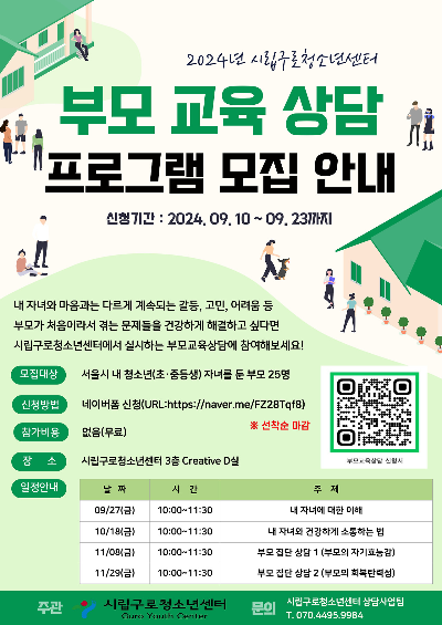 보다 자세한 사항은 시립구로청소년센터 홈페이지(www.guro1318.org) 공지 사항 내 게시글 ‘2024년 부모교육·상담 프로그램 모집’을 참고하거나 상담사업팀으로 문의하면 안내받을 수 있다.