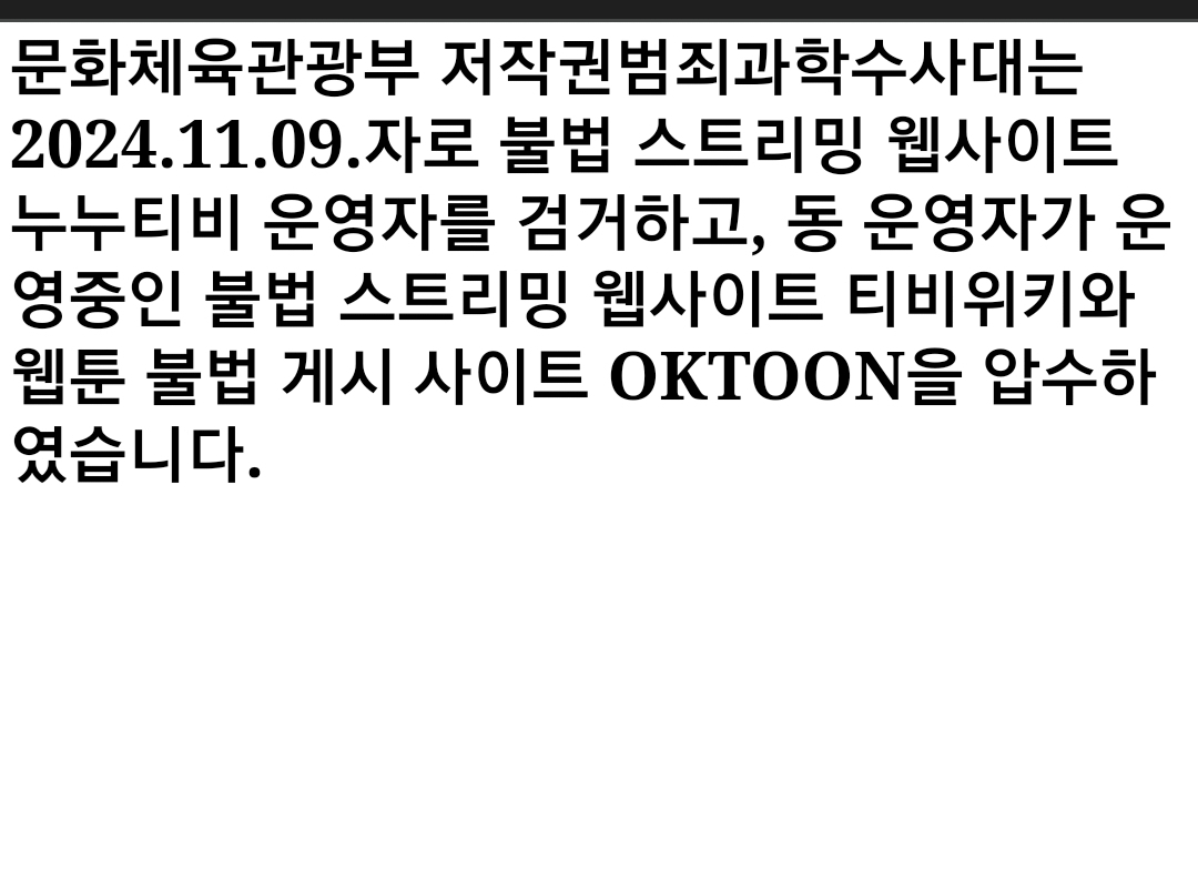 최근 OTT(온라인 동영상 서비스) 불법 콘텐츠 공유 사이트 '티비위키'가 운영자 검거와 함께 폐쇄되었다. 문화체육관광부 저작권수사대가 본격적으로 압수수색에 나서면서, 해당 사이트는 물론 관련 불법 사이트인 '누누티비'와 웹툰 불법 공유 사이트 '옥툰(OKTOON)'도 동시에 차단되었다.