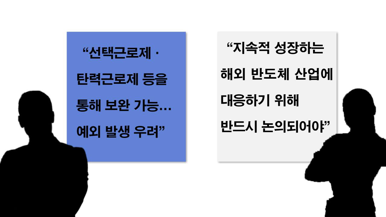 이에 대해 야당 측은 기존 근로기준법을 통해 운영되고 있는 선택근로제 및 탄력근로제 등을 통해 보완할 수 있다는 점 등을 들어 해당 조항을 삭제하는 방향으로 의견을 모은 상황이다. ‘주 52시간 예외조항’을 반도체특별법에서 다루게 될 경우, 이를 시작으로 수많은 예외들이 발생할 수 있다는 우려 역시 배경이 됐다.