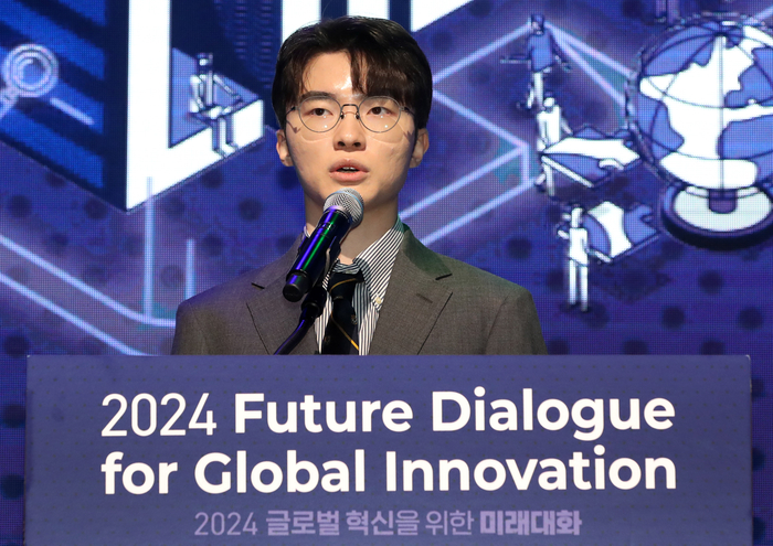 프로게이머 페이커 이상혁이 20일 서울 중구 소공동 웨스틴 조선호텔에서 외교부 주최로 열린 ‘2024 글로벌 혁신을 위한 미래대화’에서 기조연설을 하고 있다. [사진 = 청사사진기자단]