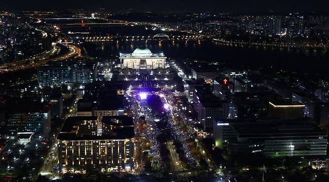 윤석열 대통령의 탄핵소추안 표결이 진행중인 7일 밤 서울 여의도 국회 앞이 시민들로 가득 차 있다. (출처: 뉴시스)
