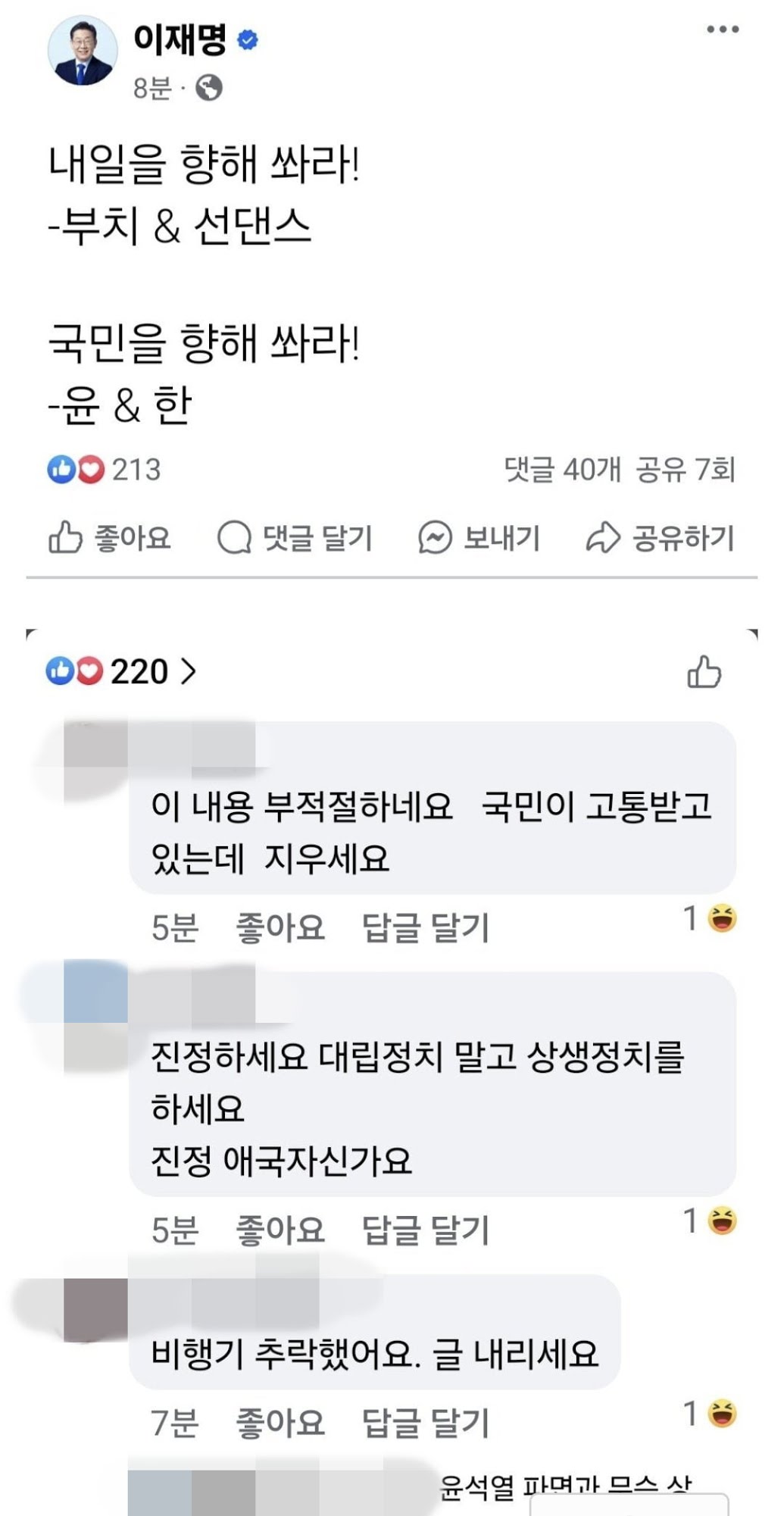 한편, 이재명 민주당 대표는 무안 공항 사고가 발생한 지 1시간 후 오전 10시8분께 페이스북에 '내일을 향해 쏴라! - 부치 & 선댄스. 국민을 향해 쏴라! 윤 & 한'이라는 글을 올렸다. 1969년 개봉한 영화 '내일을 향해 쏴라'는 미국 서부에서 은행강도단을 이끌었던 부치와 선댄스가 볼리비아로 도망간 내용을 다루고 있다.